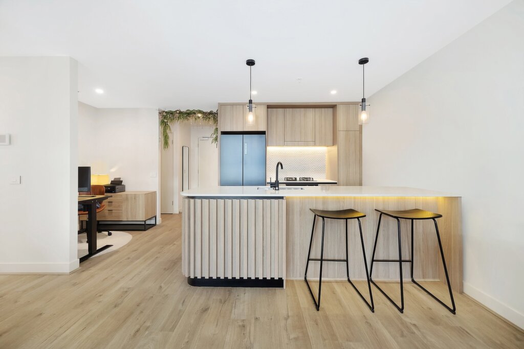 Laminate Timber flooring installed throughout the living and dining area. Master bedroom comes with private walk-in wardrobe Luxuriously designed with high-end fixtures and finishes throughoutExpansive open balcony with direct access from the living room and master bedroomCute little study/work area.Spacious open-plan living and dining areas with seamless kitchen connectionSleek, modern kitchen featuring stainless steel appliances, ample pantry space, and a large stone-topped islandDesigner bathroom with premium stone finishes, concealed cistern, and mirrored storageSplit-system air conditioning, secure car space, and additional storage cage